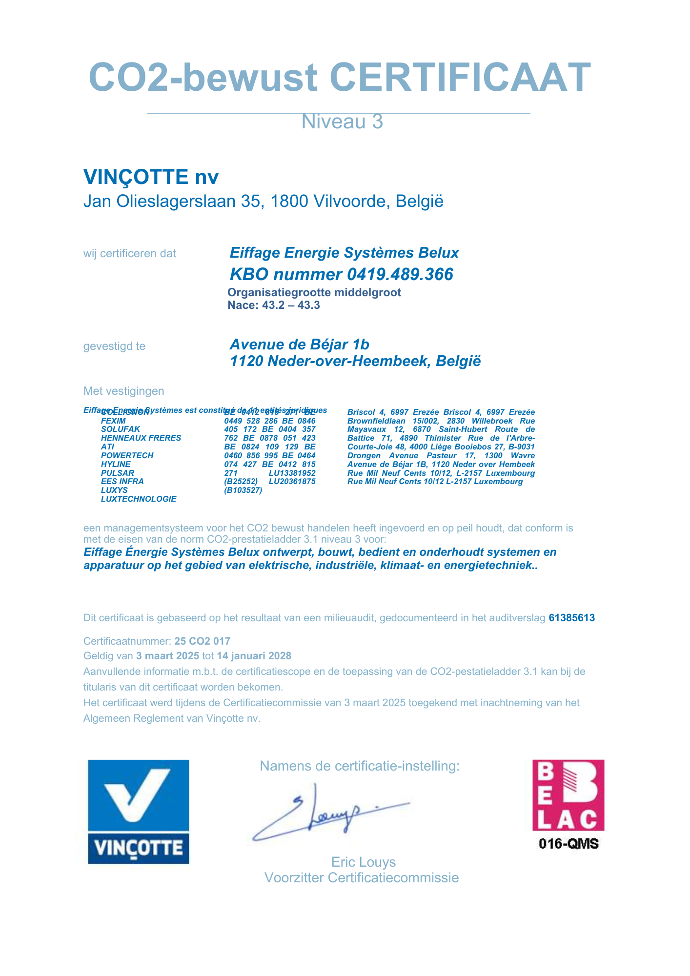 Bij Eiffage Énergie Systèmes – Belux, streven we ernaar om onze koolstofvoetafdruk te verkleinen en duurzame praktijken te bevorderen.